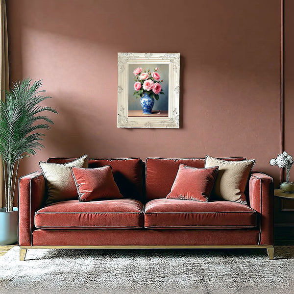 An Exquisite Still Life Oleograph on Stretched Canvas in an Ornate Gilt Gesso Rococo Frame, depicting a Still Life with Pink Roses in a Blue & White Antique Chinese Vase. The oleograph measures 16 inches x 12 inches with overall measurements in the frame being 22 inches x 18 inches. The Lithograph has a hand applied varnished finish which replicates the appearance, craquelure, patina & texture of an oil painting. Each Lithograph is a master-piece in its own right and carefully hand-finished to recreate the timeless look and appeal of an original Oil Painting.