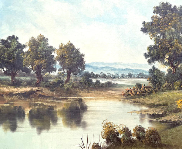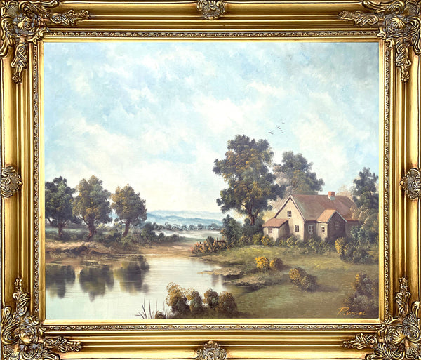 A Delightful Mid C20th Vintage Landscape Oil on Canvas by the Swiss C20th Artist P.Vogel. This beautiful oil painting depicts a Riverside Cottage in a tranquil Rural Landscape & measures 24 inches x 20 inches. Framed in an elegant ornate rococo gilt wood & gesso gallery frame, overall measurements are 29 inches x 25 inches. The painting is in excellent condition & is signed by the artist (lower right).