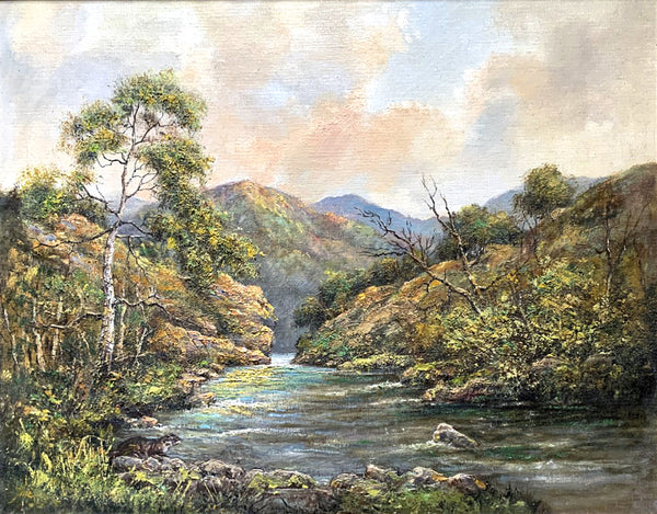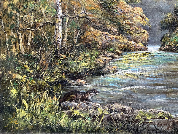 A Delightful Vintage English School Oil on Canvas Board depicting a tranquil rural river landscape with an otter by the riverbank. The painting measures 20 inches x 16 inches & is beautiful framed in an ornate gilt gesso gallery frame with overall measurements of 24 inches x 20 inches. The painting is in excellent condition & is initialled (lower left).