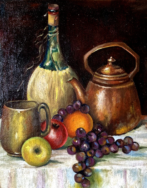 A Delightful Vintage Mid C20th Still Life Oil on Canvas Board depicting Fruit Wine & a Kettle on a Table, dated 1963. The painting measures 20 inches x 16 inches & is framed in a Mid C20th Gallery Gilt Frame with overall measurements being 25 inches x 21 inches. The painting is in good condition & is indistinctly signed & dated 1963 verso.