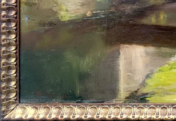 A Fine Early C20th Antique French School Oil on Artists Board depicting a Stream by a Cottage, signed "Perron" & dated 26. This delightful oil measures 12 inches x 9 inches & is elegantly framed in an ornate gilt gesso gallery frame with overall measurements being 14 inches x 11 inches. The painting is in good condition with no damage or losses.