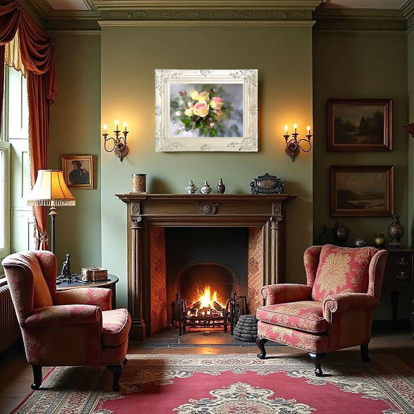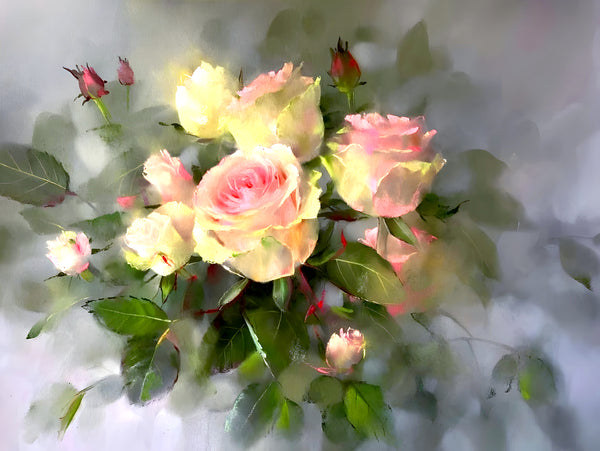 An Exquisite Still Life Oleograph on Stretched Canvas in a stunning highly Ornate Hand Finished Rococo Frame, depicting Pink & Yellow Roses. The oleograph measures 16 inches x 12 inches with overall measurements in the frame being 22 inches x 18 inches. The oleograph has the appearance, patina & texture of an oil painting.
