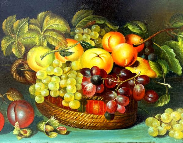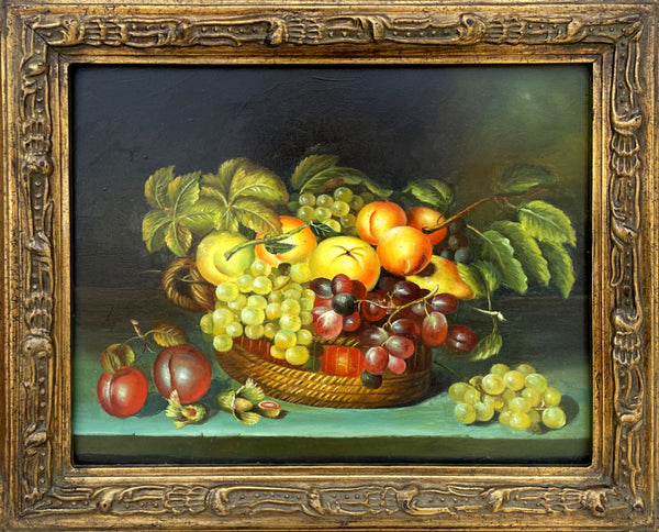 An Exquisite Vintage Dutch School Still Life Oil on Panel depicting Peaches, Plums, & Grapes on a Marble Ledge. This delightful Oil Painting measures 10 inches x 8 inches & is elegantly framed in an imposing Vintage Ornate Gilt Wood & Gesso Gallery frame with overall measurements being 15.5 inches x 13.5 inches. The painting is in excellent condition with no damage or losses & is unsigned on the front but indistinctly signed verso.