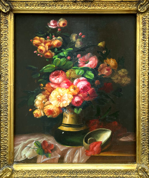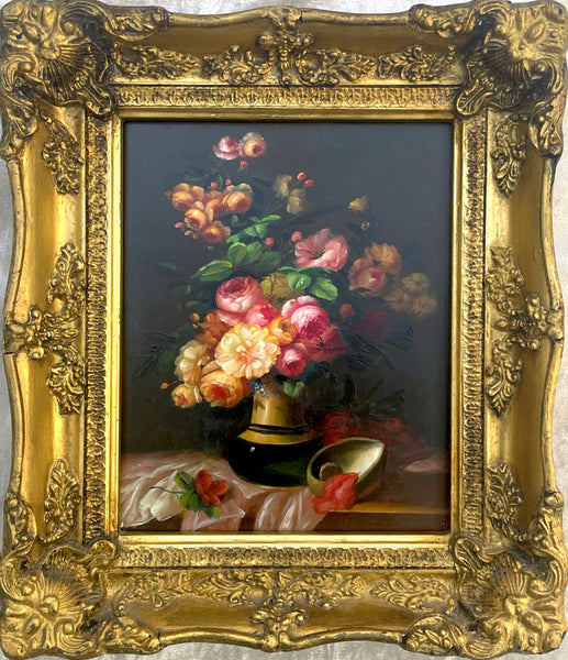 An Exquisite Vintage Mid C20th Dutch School Oil on Board depicting Flowers in a Vase. This delightful painting measures 10 inches x 8 inches & is elegantly framed in an ornate rococo gilt wood & gesso gallery frame with overall measurements being 14 inches x 12 inches. The painting is in good condition with no damage or losses & is unsigned.