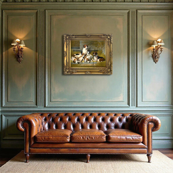 A Very Fine Oleograph on Stretched Canvas in an Ornate Hand Finished Rococo Frame, study of Foxhounds in a Stable after the original by John Emms. The oleograph measures 16 inches x 12 inches with overall measurements in the frame being 22 inches x 18 inches. The Oleograph has a hand applied varnished finish which replicates the appearance, craquelure, patina & texture of an oil painting. Each Oleograph is a master-piece in its own right and carefully hand-finished to recreate the timeless look and appeal of an original Oil Painting.