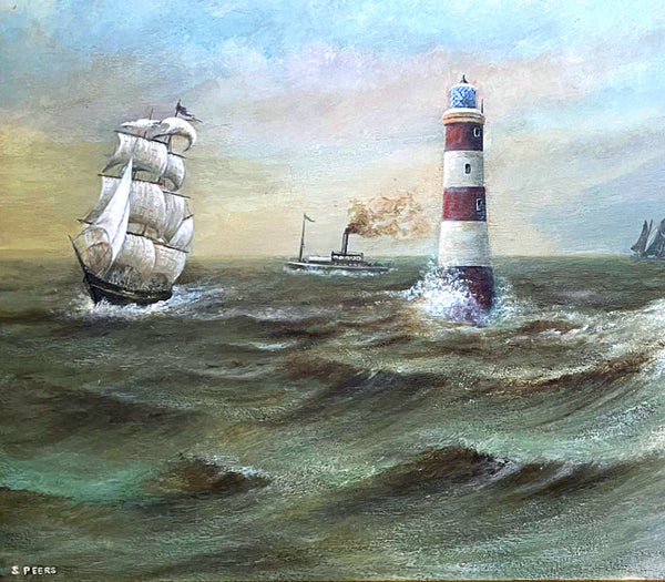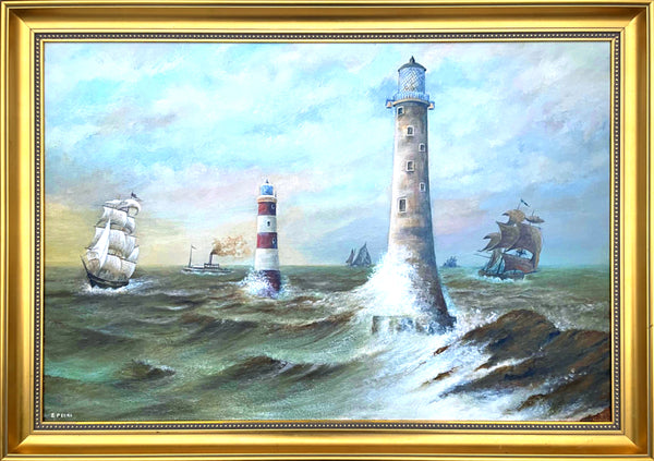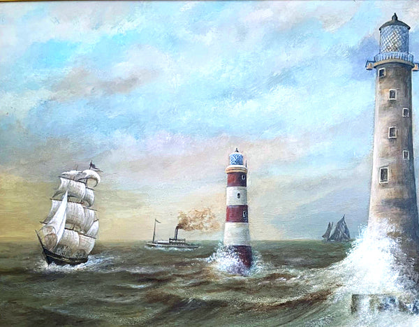 Fine Large Vintage Nautical Oil on Board - Shipping & Lighthouses in Choppy Seas