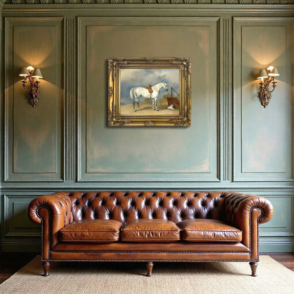 A Superb Oleograph on Stretched Canvas in an Ornate Rococo Frame, - portrait of a side saddled grey hunter after the original by John Ferneley. The oleograph measures 16 inches x 12 inches with overall measurements in the Hand Painted Gesso Gallery frame at 22 inches x 18 inches. The oleograph has a hand applied varnished finish with replicates the appearance, craquelure, patina & texture of an oil painting.