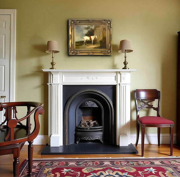 A Fine Oleograph on Stretched Canvas in an Ornate Rococo Frame, depicting a Saddled White Hunter in a Yard . The oleograph measures 16 inches x 12 inches with overall measurements in the Gilt Gesso Gallery frame being 22 inches x 18 inches. The oleograph has a hand applied varnished finish with replicates the appearance, craquelure, patina & texture of an oil painting.
