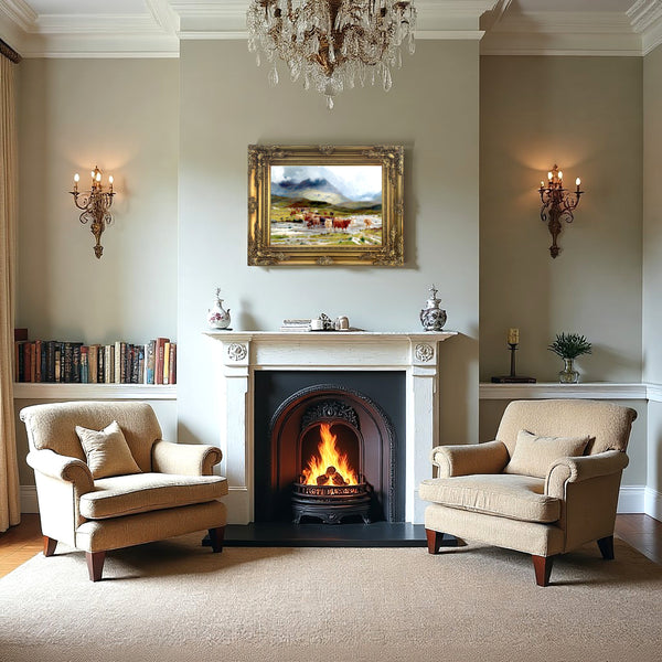A Fine Oleograph on Stretched Canvas in an Ornate Rococo Frame, depicting Highland Cattle crossing a stream. The Oleograph measures 16 inches x 12 inches with overall measurements in the Hand Painted Gesso Gallery frame being 22 inches x 18 inches. The Oleograph has a hand applied varnished finish with replicates the appearance, craquelure, patina & texture of an oil painting.