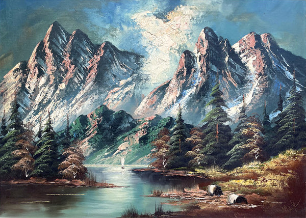 A Fine Vintage Mid C20th European School Oil on Canvas depicting an extensive Alpine Scene. The painting measures 28 inches x 20 inches & is elegantly framed in a painted wood gallery frame with overall measurements being 32 inches x 24 inches. The painting is in good condition with no damage or losses & is indistinctly signed (lower right).