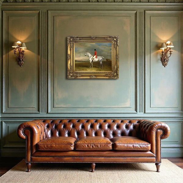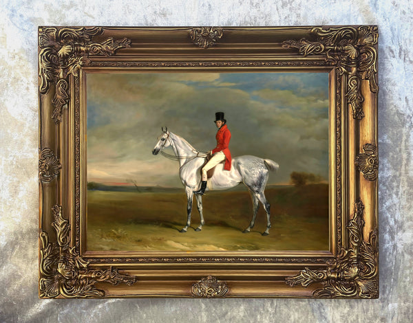 A Fine Oleograph on Stretched Canvas in an Ornate Rococo Frame, depicting a Huntsman on a Grey Horse, after the original by John Ferneley. The oleograph measures 16 inches x 12 inches with overall measurements in the Hand Painted Gesso Gallery frame being 22 inches x 18 inches. The oleograph has a hand applied varnished finish with replicates the appearance, craquelure, patina & texture of an oil painting.