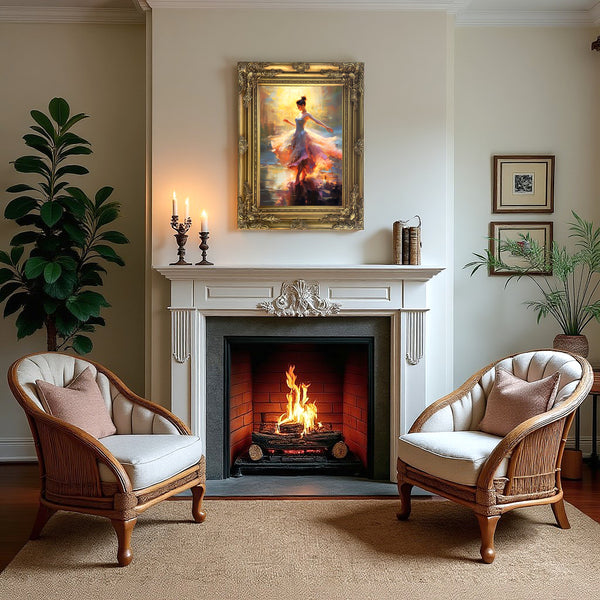 A Fine Oleograph on Stretched Canvas in an Ornate Rococo Frame, depicting a Dancer in Pastel Blue. The oleograph measures 16 inches x 12 inches with overall measurements in the Gilt Gesso Gallery frame being 22 inches x 18 inches. The Oleograph has a hand applied varnished finish which replicates the appearance, craquelure, patina & texture of an oil painting. Each Oleograph is a master-piece in its own right and carefully hand-finished to recreate the timeless look and appeal of an original Oil Painting.