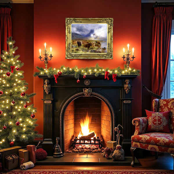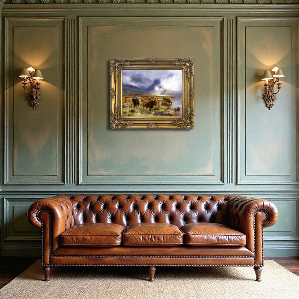 A Very Fine Oleograph on Stretched Canvas in an Ornate Hand Finished Rococo Frame, depicting Highland Cattle by the River Tay, after the original by Louis Bosworth Hurt. The Oleograph measures 16 inches x 12 inches with overall measurements in the frame being 22 inches x 18 inches. The Oleograph has a hand applied varnished finish which replicates the appearance, craquelure, patina & texture of an oil painting. Each Oleograph is a master-piece in its own right and carefully hand-finished to recreate the timeless look and appeal of an original Oil Painting.